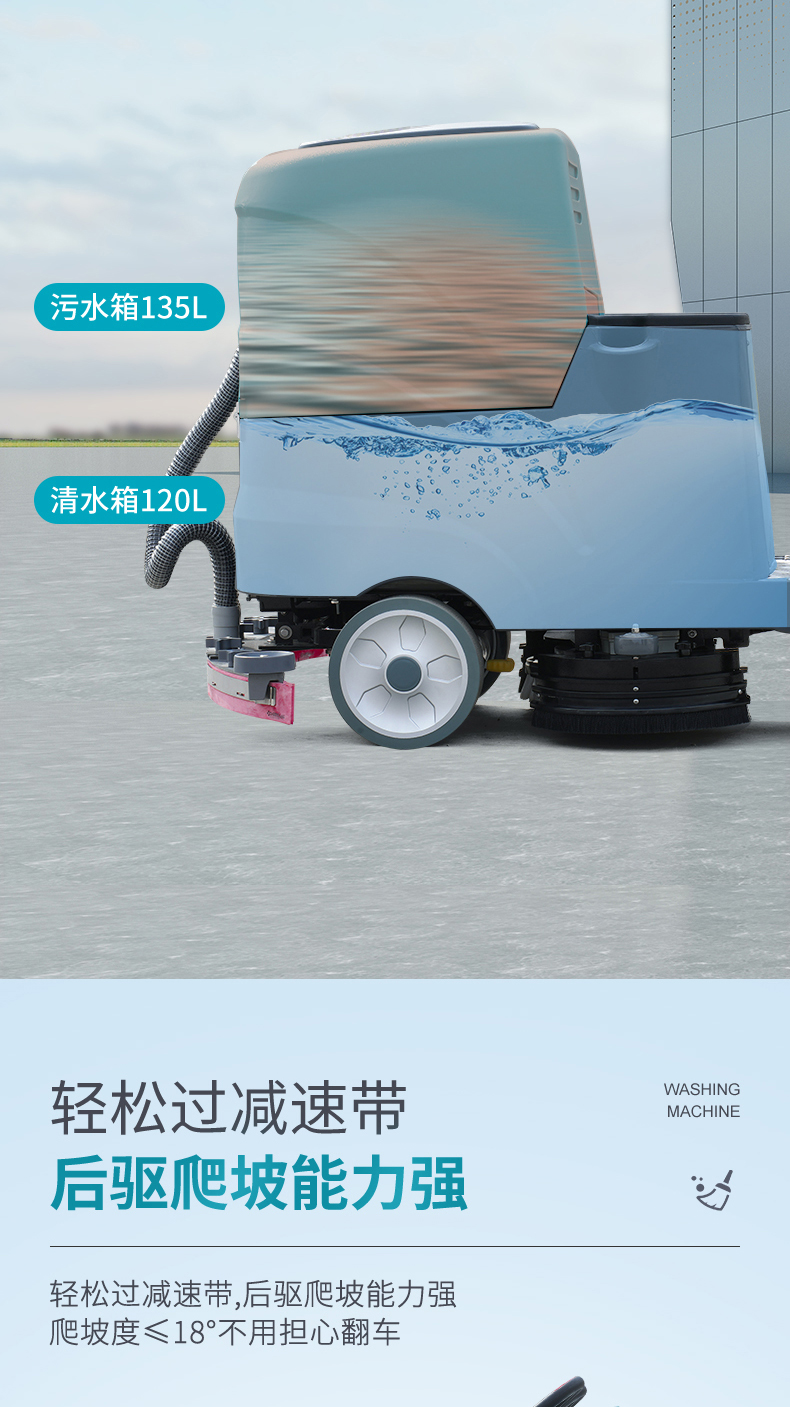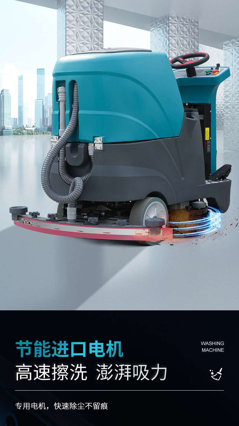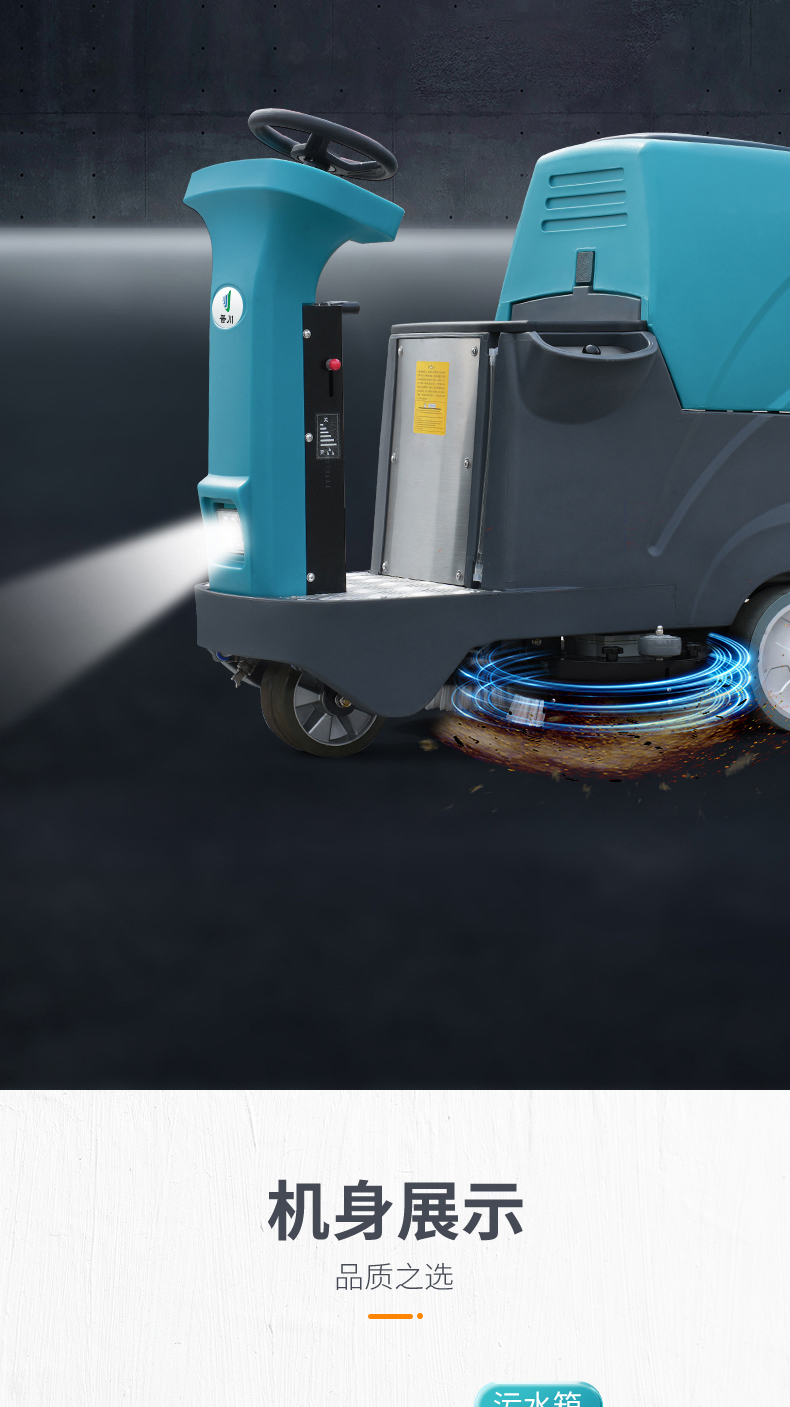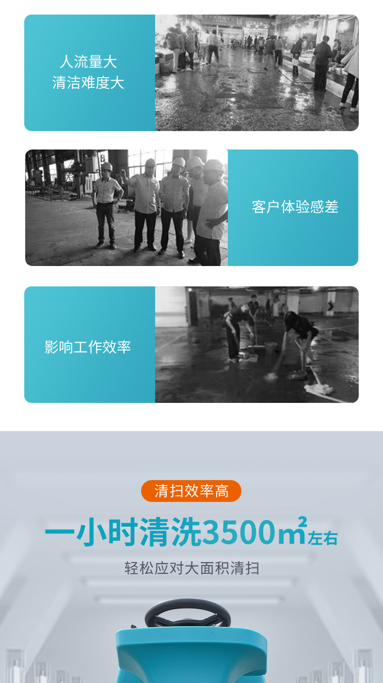 · 工作效率高,機械化操作,每小時可清洗3500平方左右;超大水箱,解決了小型洗地機需頻繁加水的難題;洗刷,吸干一體化設(shè)計,使用后地面干爽