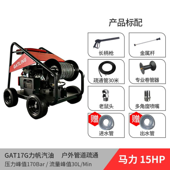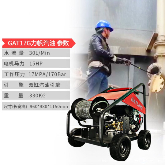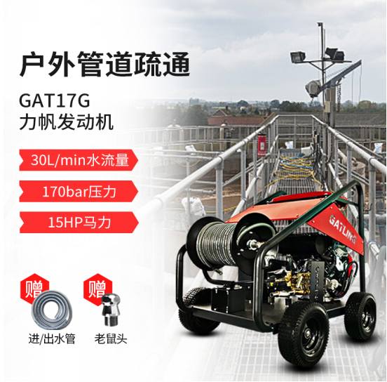 加特林出品的GAT17G戶外引擎管道疏通機(jī),力帆LIFAN品牌電打火啟動汽油發(fā)動機(jī),采用高精準(zhǔn)陶瓷柱塞曲軸泵提供可靠170bar操作壓力和30L/Min出水流量,15HP功率;專注于戶外管道疏通和船業(yè)制造清洗以及維修船舶沖洗污漬等