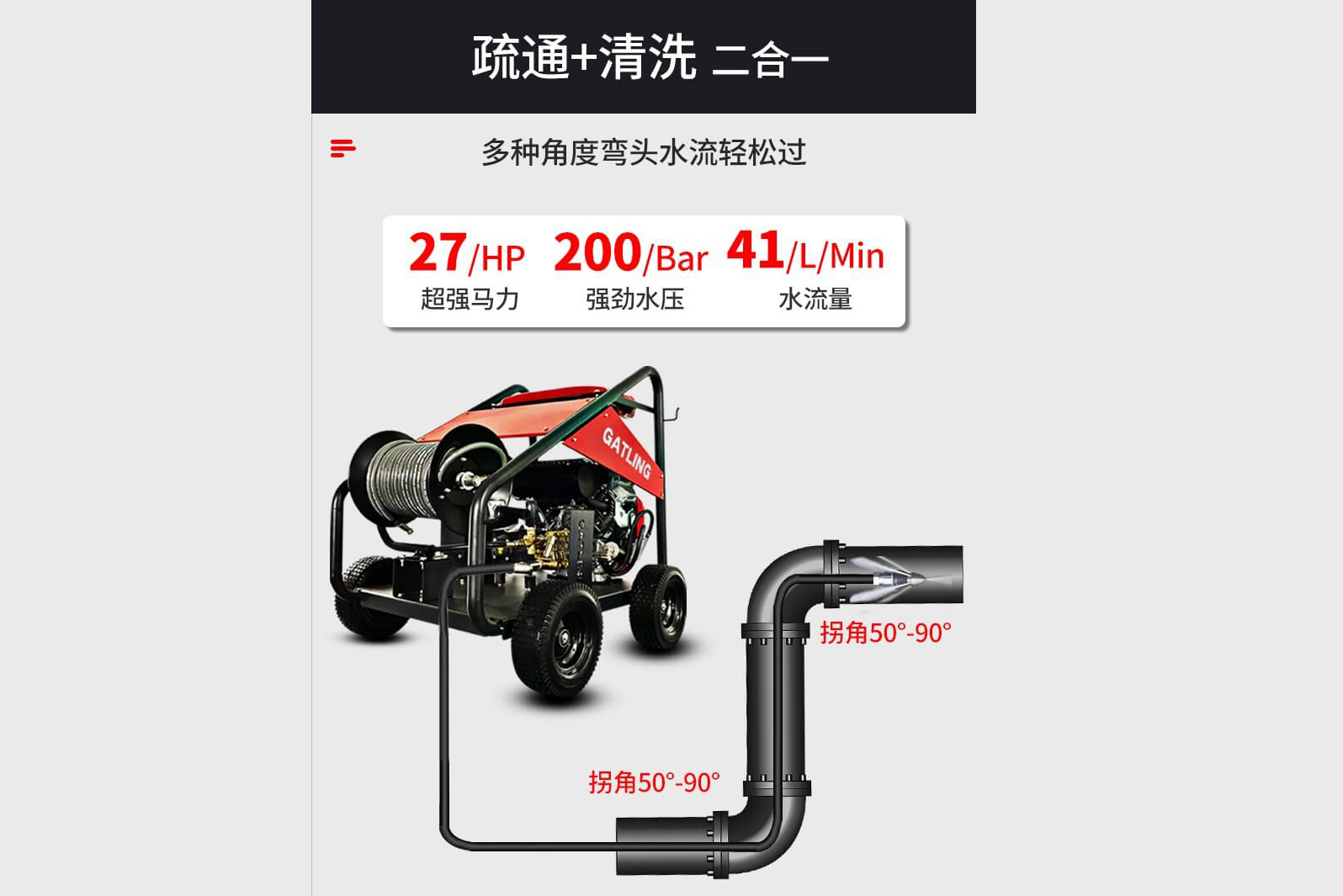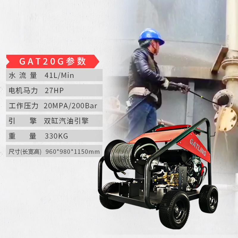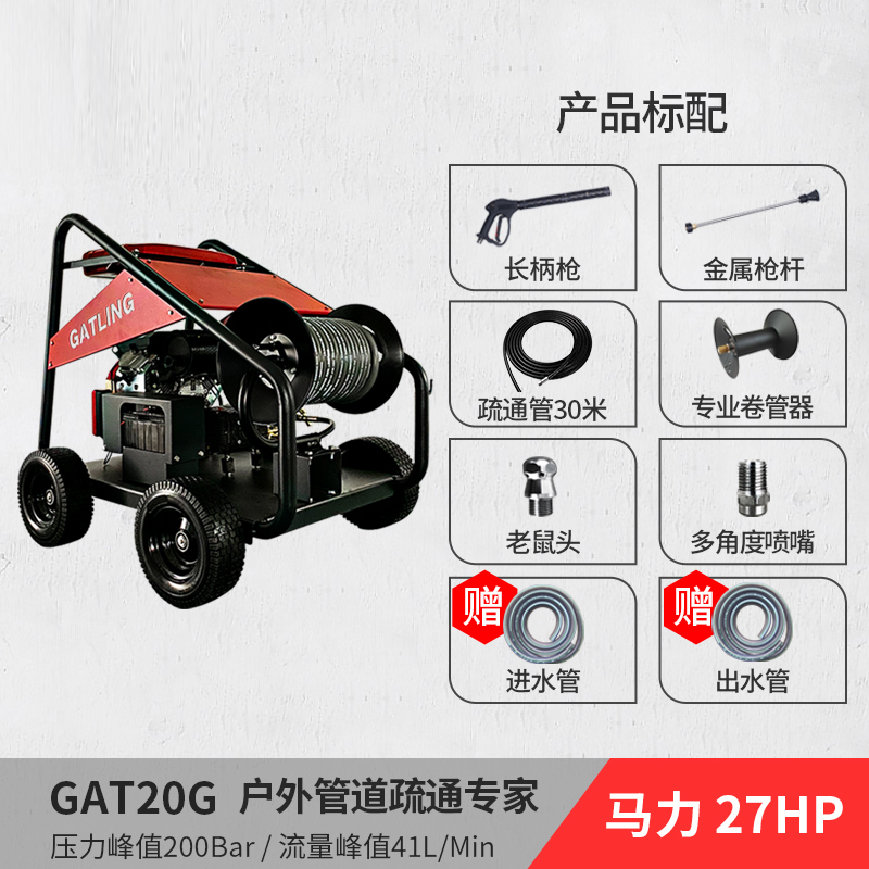 品牌/型號 | 加特林/GAT20G | 標準配件: 1.工業(yè)級疏通管 30米/根 2.高壓槍 1把 3.角度噴嘴 2個 4.不銹鋼老鼠頭 1個 5.自動卷管器 1套 |
